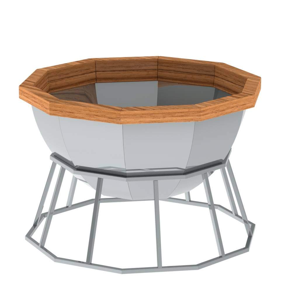 10-гранный банный чан на подставке – это увеличенный вариант базовой модели (чан 8 граней на подставке). Рассчитан на большую компанию из 8-10 человек. Предназначен для эксплуатации только в теплое время года, так как ветрозащита в конструкции не предусмотрена. Но ее можно приобрести отдельно и использовать чан круглогодично.Модель представлена в премиальном исполнении: экологически чистая пищевая сталь, высококачественная древесина алтайского кедра, устойчивая термостойкая подставка. Комплектация предлагается под ключ: это влагоустойчивые деревянные сидения, решетка для защиты ног, лестница, покрытая специальным противоскользящим составом. По желанию заказчика, можем изменить толщину стенки (3 мм или 2 мм), марку стали (AISI 430 или AISI 304), соорудить лестницу-подиум, добавить топку.