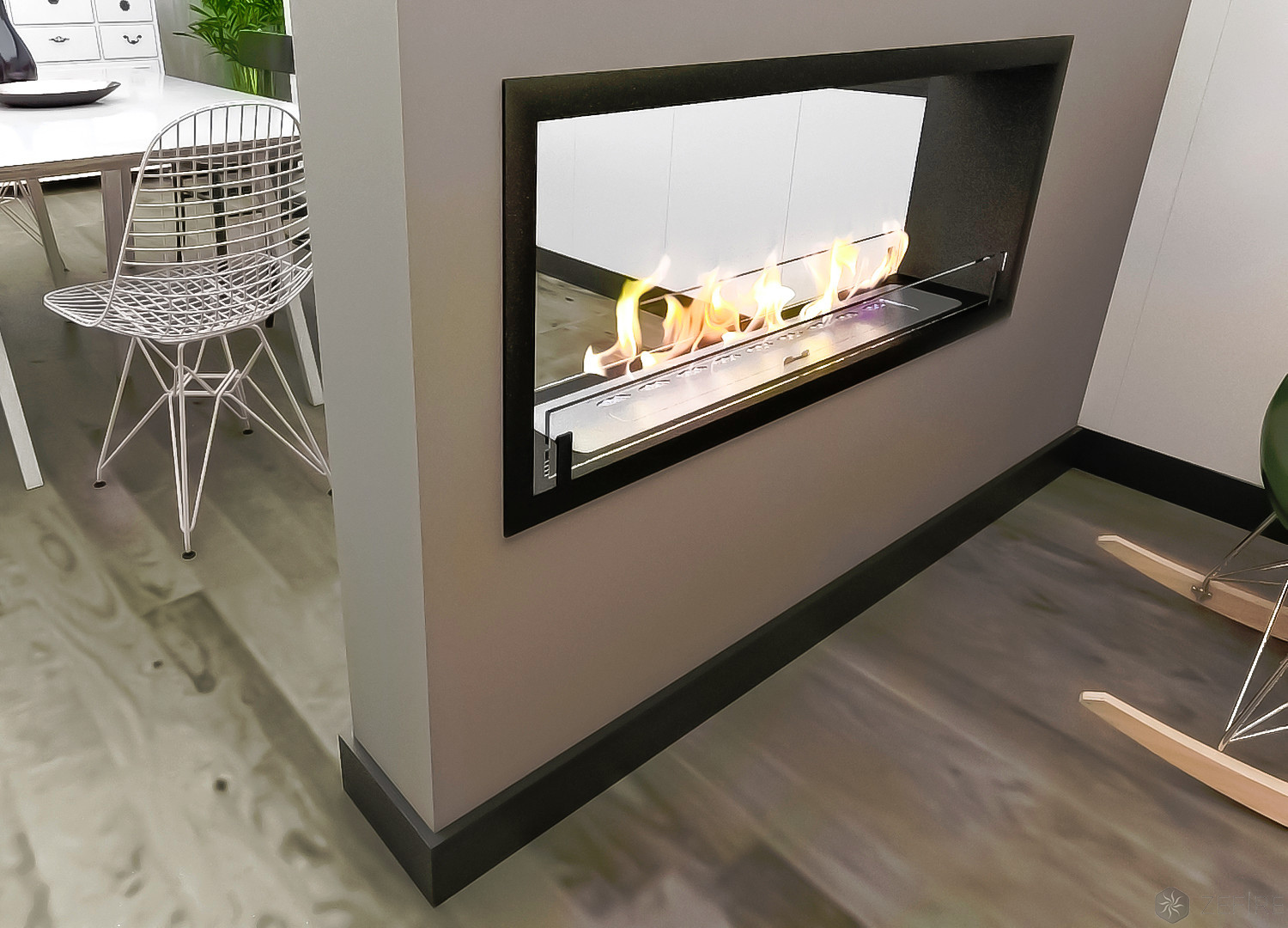 Биокамин Contour сквозной 1100 от Estetic Flame – это красота и уют живого пламени без потери полезной площади. Из всех встраиваемых версий такой двухсторонний очаг единственный устанавливают в процессе возведения стены (короба, стеллажа и др.), а не в готовую нишу. Но результат стоит усилий: камин украшает живым огнем одновременно две комнаты или зоны, объединяя их в уютное пространство.