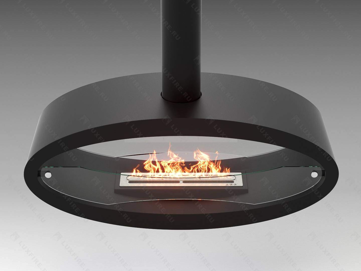 Представляет собой эллептическую металлическую конструкцию класса S, с подвесом к потолку с топливным блоком Lux Fire 500S ограниченную с двух сторон закаленным стеклом в котором горит живой огонь. Телескопическая труба-держатель подходит к любой высоте потолка и регулируется по длине.Не располагайте биокамин вблизи легко-воспламеняемых материалов : шторы, аудио-видео техника, картины и т.п.