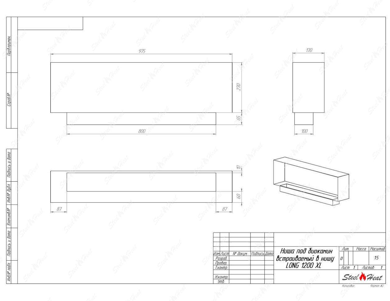 Встраиваемый Биокамин SteelHeat LONG-H 1200 XL предназначен для встраивания в глухие ниши из гипсокартона, кирпича, пеноблоков, бетона.