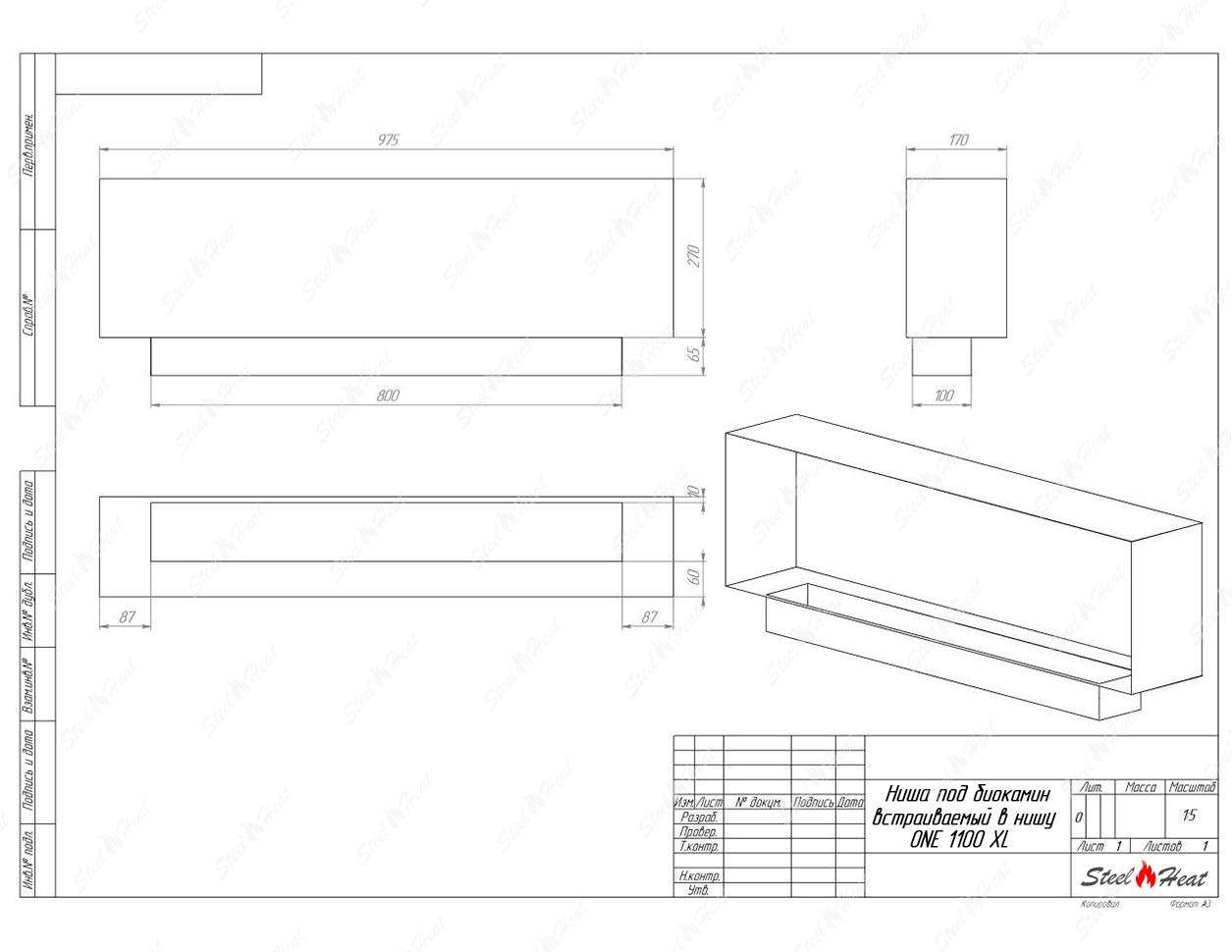 Встраиваемый Биокамин SteelHeat ONE 1100 XL предназначен для встраивания в глухие ниши из гипсокартона, кирпича, пеноблоков, бетона.