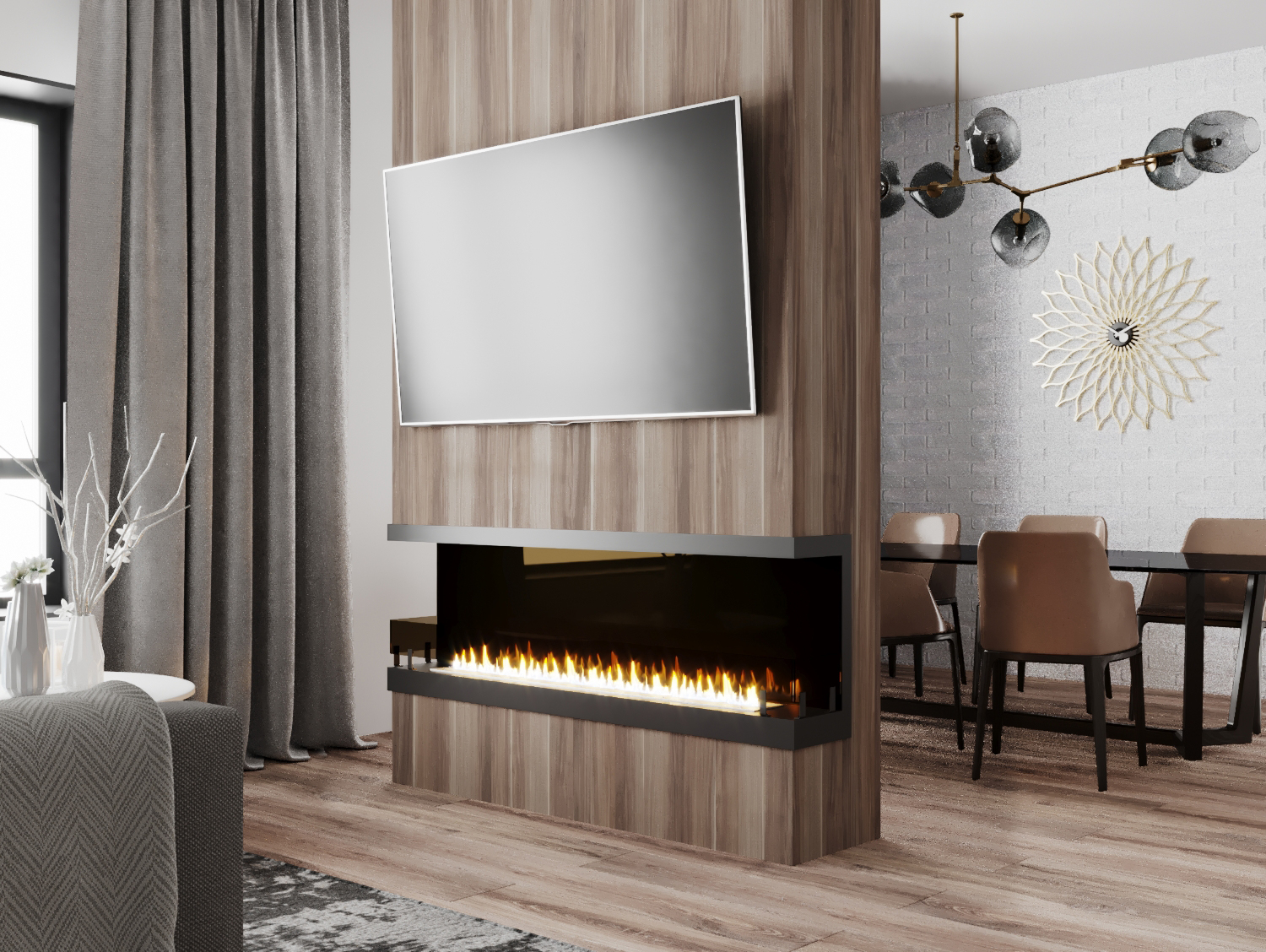 Встраиваемые варианты разделяются на такие как классические, устанавливаемые в подготовленное отверстие в стене или нише. Угловые, которые монтируются в угловую часть стены. Торцевые – открытые с трёх сторон. И сквозные, вид живого огня которых доступен в разных комнатах.