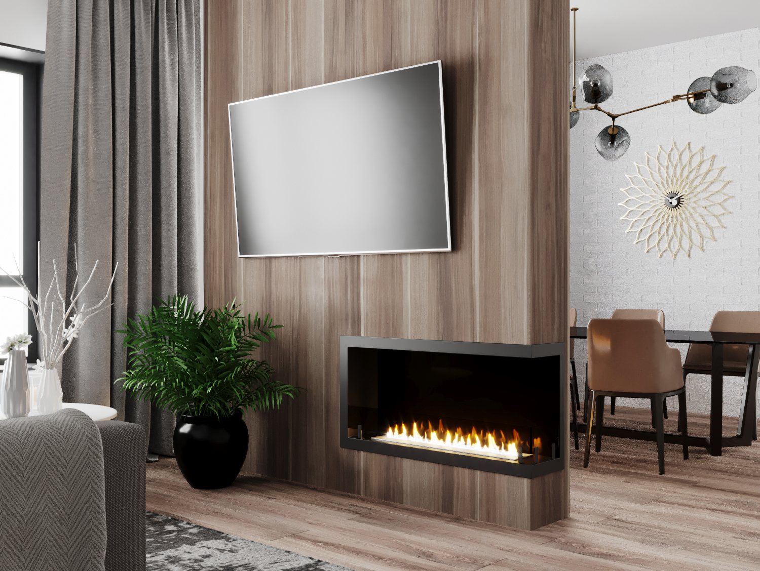 Встраиваемые варианты разделяются на такие как классические, устанавливаемые в подготовленное отверстие в стене или нише. Угловые, которые монтируются в угловую часть стены. Торцевые – открытые с трёх сторон. И сквозные, вид живого огня которых доступен в разных комнатах.