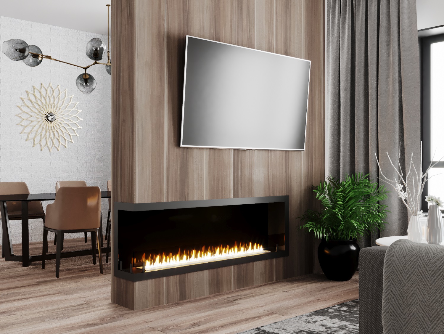 Встраиваемые варианты разделяются на такие как классические, устанавливаемые в подготовленное отверстие в стене или нише. Угловые, которые монтируются в угловую часть стены. Торцевые – открытые с трёх сторон. И сквозные, вид живого огня которых доступен в разных комнатах.
