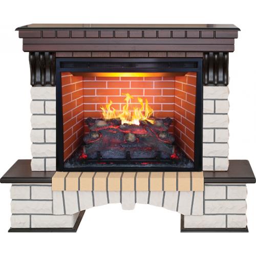 Портал каминокомплекта визуально состоит из двух частей – очага и основания. Очаг обрамляют каменные стенки, верхняя часть которых украшена декоративными резными консолями. Они визуально поддерживают высокую каминную крышку, кромка которой оформлена геометрическим орнаментом. Непосредственно очаг обрамляет вставка из МДФ, поверхность которой украшает геометрический узор. Основание камина имеет П-образную форму. По бокам на нее уложены тонкие полочки из МДФ, а непосредственно зона очага оформлена камнем, имитирующим клинкерный кирпич. Свод арки украшен каменным клином, а довершает образ декоративная филенка, обрамляющая основание снизу. Под камином сформирована ниша, в которую при желании можно уложить декоративные поленья. Поверхность камня расшита под кирпич, а его поверхность имеет «дикую» фактуру.