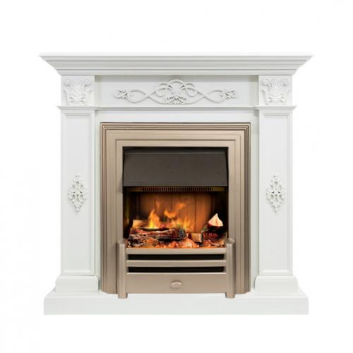 Портал каминокомплекта выполнен в классическом стиле, но в его оформлении также присутствуют нотки романтики. Это и делает актуальным его установку в соответствующих по стилю интерьерах. Обрамляют очаг прямоугольные колонны, в центральной части которых имеются декоративные вставки. Консоли колонн также украшены декоративной лепниной. Витиеватый резной узор присутствует и на верхней панели портала. Колонны визуально поддерживают широкую многоступенчатую каминную крышку. Ее основание украшено тонкой цепочкой резьбы.