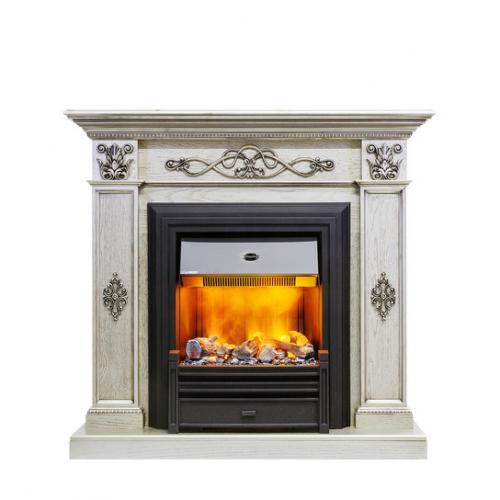 Портал каминокомплекта выполнен в классическом стиле. Боковые панели выполнены в форме колонн, оканчивающихся декоративными кронштейнами. Они визуально поддерживают ступенчатую крышку камина, выступающую вперед и по бокам. Центральная часть колонн и кронштейны оформлены декоративной лепниной. Верхняя панель украшена изящным витым узором. Вся конструкция установлена на невысокое основание, приподнимающее визуально очаг над полом.
