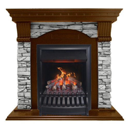 Очаг черного цвета также выполнен в классическом стиле и гармонично сочетается с расцветкой портала. Его нижняя часть выступает немного вперед и формирует своеобразную колосниковую корзину. Внутрь нее вставлен механизм имитации пламени. От посторонних глаз он дополнительно скрыт керамическим муляжом, имитирующим горящие Муляж дров и угли. По внешним характеристикам муляж мало отличается от настоящих дров. Внутренние стенки очага декорированы под черный металл, что позволяет подчеркнуть всю красоту пламени.
