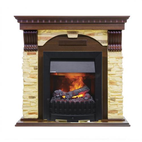 Портал каминокомплекта выполнен в классическом стиле с элементами рустикального. Последнее обеспечивается сочетанием в дизайне дерева и камня. Декоративных элементов немного, и в целом оформление портала строгое. Боковые стенки сверху оформлены резными изогнутыми консолями, поддерживающими массивную каминную крышку. Ее кромка оформлена декоративным резным фризом. В зоне очага присутствует вставка, выполненная из МДФ. Установлен же портал на невысокое плоское основание, обеспечивающее оптимальный уровень устойчивости.