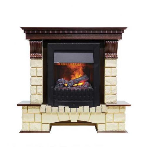 Каминокомплект «Pierre Luxe» от производителя Dimplex комплектуется современным паровым очагом «Danville Black», в котором реализована технология имитации пламени Opti-Myst. Стиль кантри, который использовался при создании портала, подчеркнут гармоничным сочетанием камня цвета шампань и декоративных элементов, выполненных в цвете темного дуба. Общая строгость конструкции подчеркнута черным цветом очага. При внешней массивности камин имеет относительно компактные габариты, что дает возможность установить его даже в небольших по площади помещениях. Соответственно стилю портала лучшим вариантом для такого комплекта будут классические интерьеры.