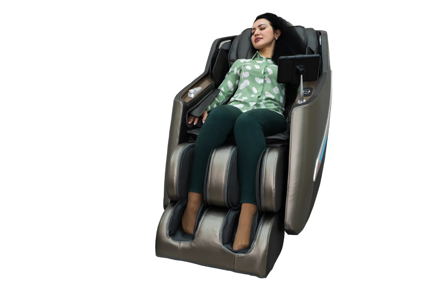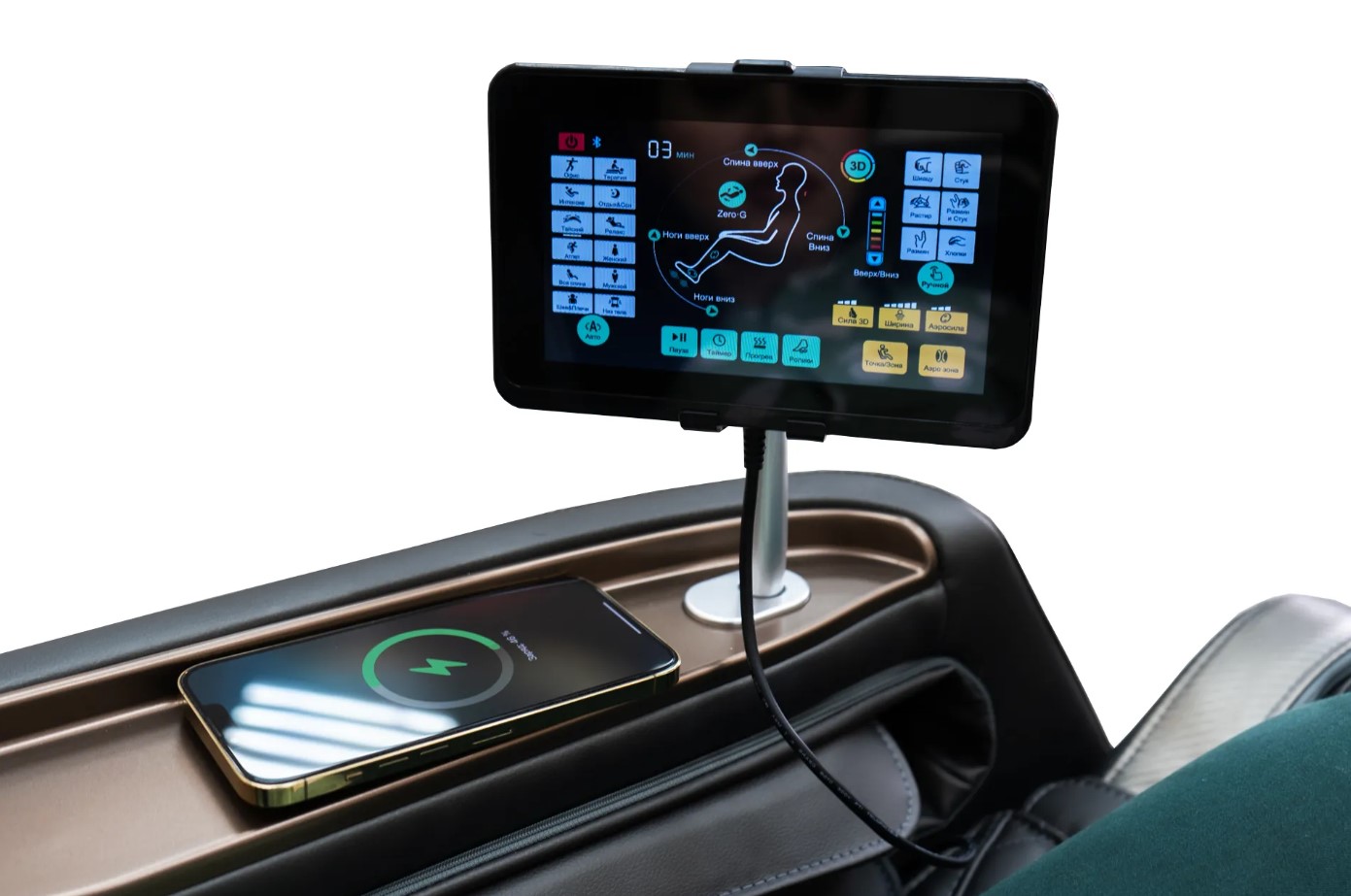 В подлокотник кресла встроена панель беспроводной зарядки смартфона - чтобы от массажа не отвлекали даже такие мелочи, как низкий заряд.