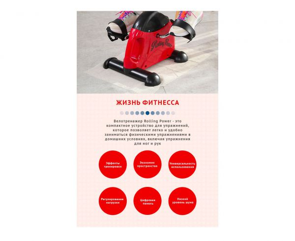 Велотренажер мини DFC B1R - модель предназначена для тех, кто любит заботиться о своём здоровье и вести активный образ жизни. Благодаря лёгкому весу и удобной ручке на корпусе, тренажёр можно легко перемещать и использовать в любом месте дома. Rolling Power подходит как для тренировки ног, так и рук.
